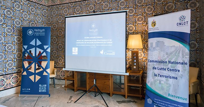 في إطار متابعة تنفيذ برنامج “الاتصالات الاستراتيجية وحملات الخطاب البديل لخطاب العنف والتطرف في تونس” الذي تنفذه اللجنة الوطنية لمكافحة الإرهاب بالتعاون مع مركز هداية الدولي للتميز لمكافحة التطرف العنيف وبدعم من وزارة الشؤون العالمية الكندية انعقد لقاء عمل جمع ممثلي اللجنة الوطنية لمكافحة الإرهاب بسعادة سفير كندا بتونس مرفوقا بوفد من السفارة والمديرة الاولى لبرامج بناء القدرات في مجال مكافحة الإرهاب بوزارة الشؤون العالمية الكندية إلى جانب فريق عمل عن مركز هداية و ممثل عن وزارة الشؤون الدينية تم خلاله استعراض أهم الأنشطة البرنامج المنجزة والمبرمجة خلال المرحلة القادمة ومدى مساهمتها في تنفيذ الاستراتيجية الوطنية لمكافحة التطرف العنيف والإرهاب 2023/2027 ودعم مشاريع مخططها التنفيذي وبحث سبل تطوير التعاون في مجالات الاتصال الاستراتيجي وتعزيز الخطاب البديل وترسيخ المقاربات الوقائية الشاملة.